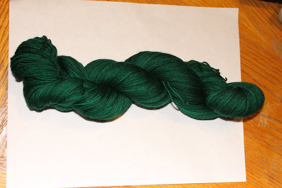 Well, that almost all worked for me. I screwed up in weighing the dye. My calculations, using the info from the manufacturer's website, was that I wanted 1 gram of dye. I tried to weigh that out, and nope, couldn't weigh it. I had somewhere around a gram, but how close, no idea. My calculations are also possibly way off. So, I make my dye bath, and I add in my soaked fingering yarn in water that was around 120° F. It looked black. Oh S**T! Quick, I want to keep the yarn from becoming so dark you can't see the green unless you are in bright light. I grab a skein of worsted and drop it in the pot and squeeze it so it quickly gets wet and soaks up dye.